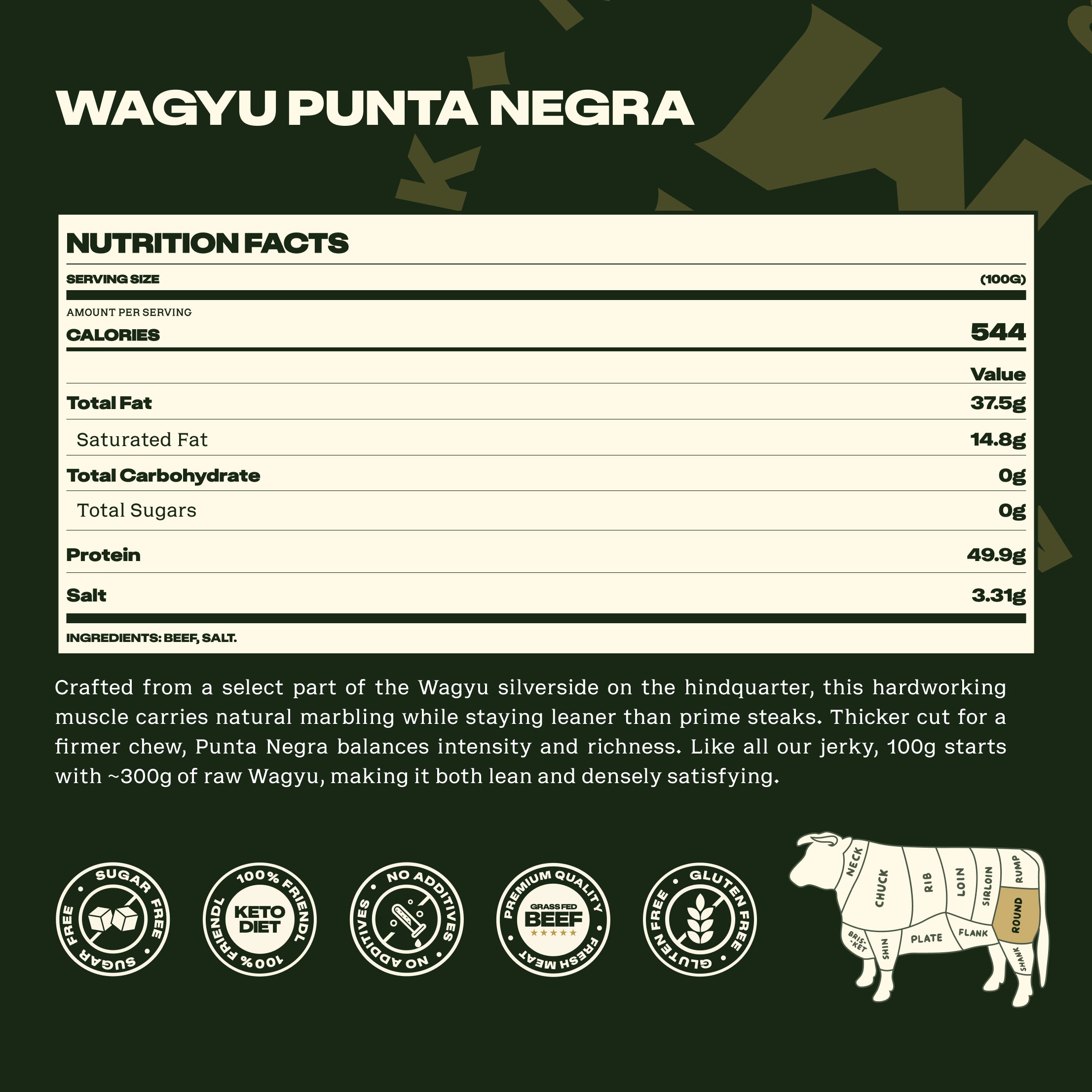 No sugar. No preservatives. No compromises. Just grass-fed Wagyu and Anglesey sea salt, refined into the ultimate expression of flavour.